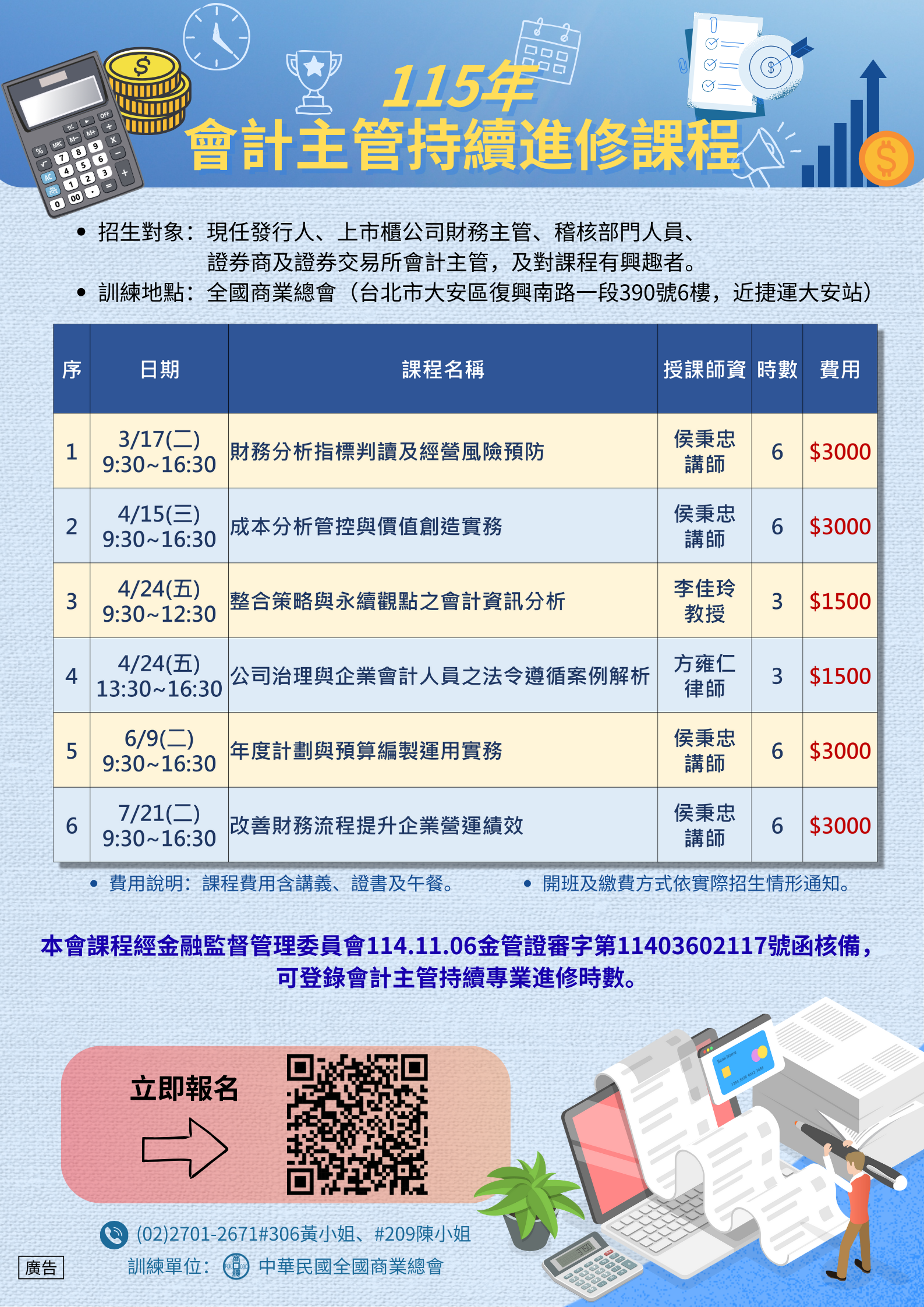 中華民國全國商業總會辦理「115年會計主管持續進修課程」,請踴躍報名。
