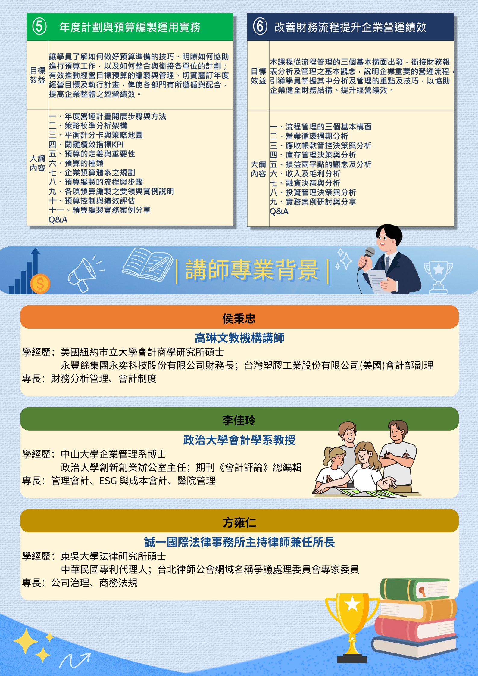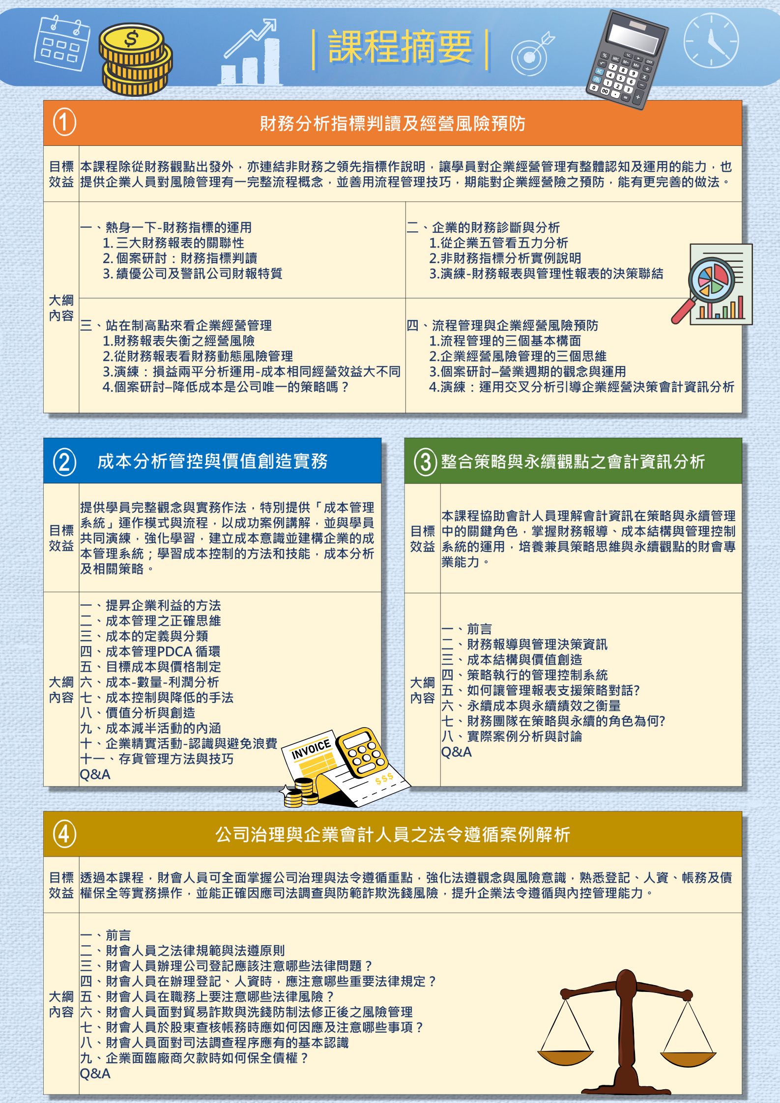 二、課程邀請具豐富實務經驗之專業師資授課,課程內容涵蓋財務分析、成本管理、公司治理、法令遵循、年度預算編製、內部控制與流程改善等主題,協助學員掌握最新法規趨勢與企業實務發展,提升專業判斷力與管理效能。